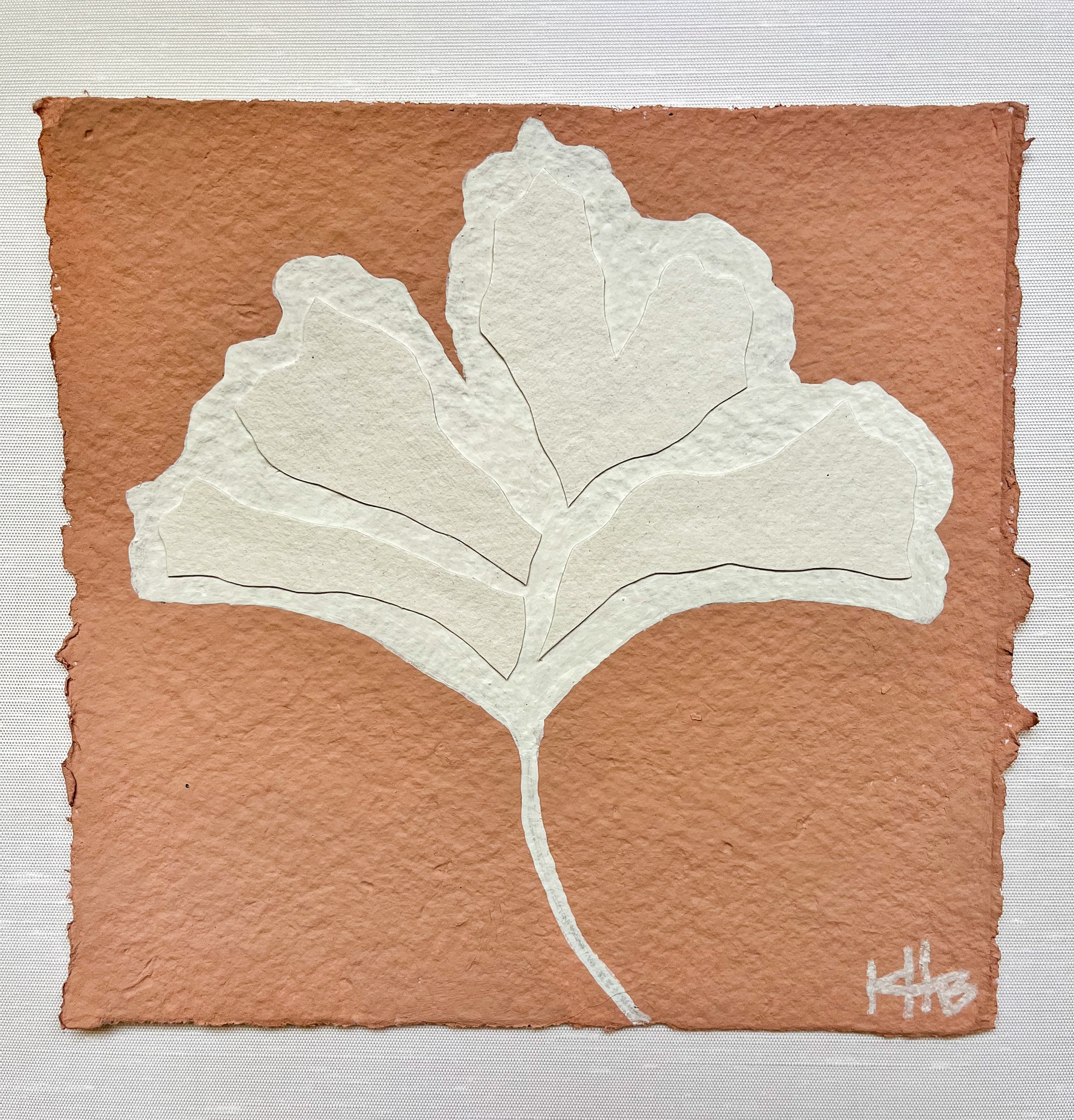 7x7 Coral Ginkgo Leaf, Original Artwork by Kendal Blanchard, Southern artist, Southern art, Flower art, Botanical art, Textured art, Collaged art, Classic artwork, Timeless art, Blue and white artwork, Foliage artwork, Traditional artwork, Original artwork, Traditional home artwork, Painted flowers, Botanicals  Florals, Floral artwork, Coastal artwork