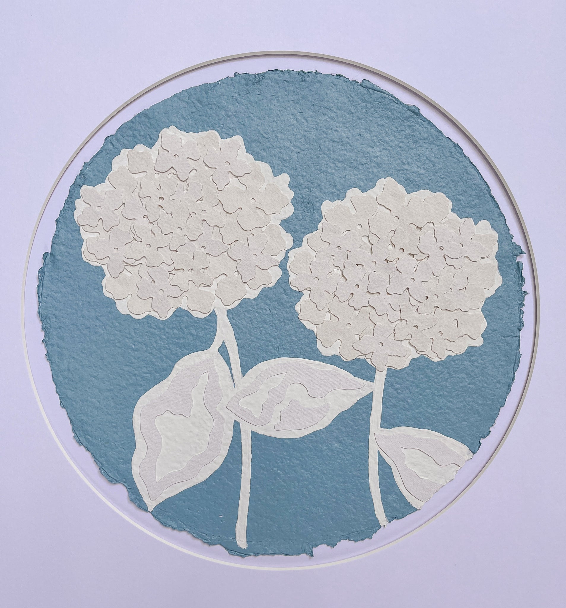 Each hydrangea circle is 12 inch diameter and matted to 20x20. This item is sold with the circular matting only.  If you would like your piece framed, please purchase the piece and then message Kendal for framing.