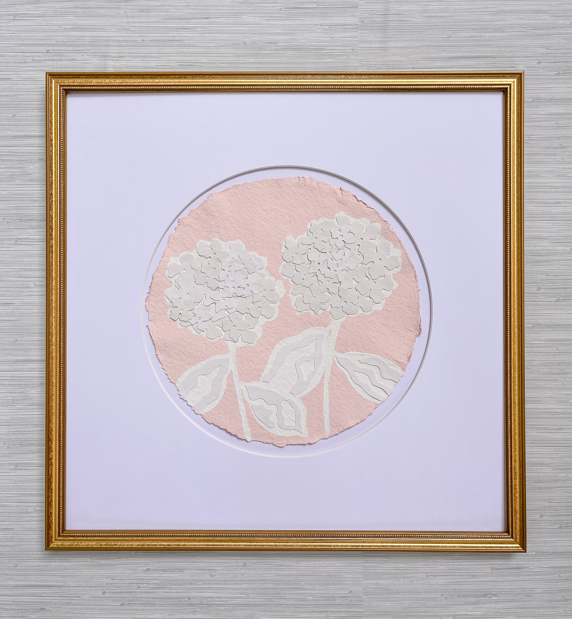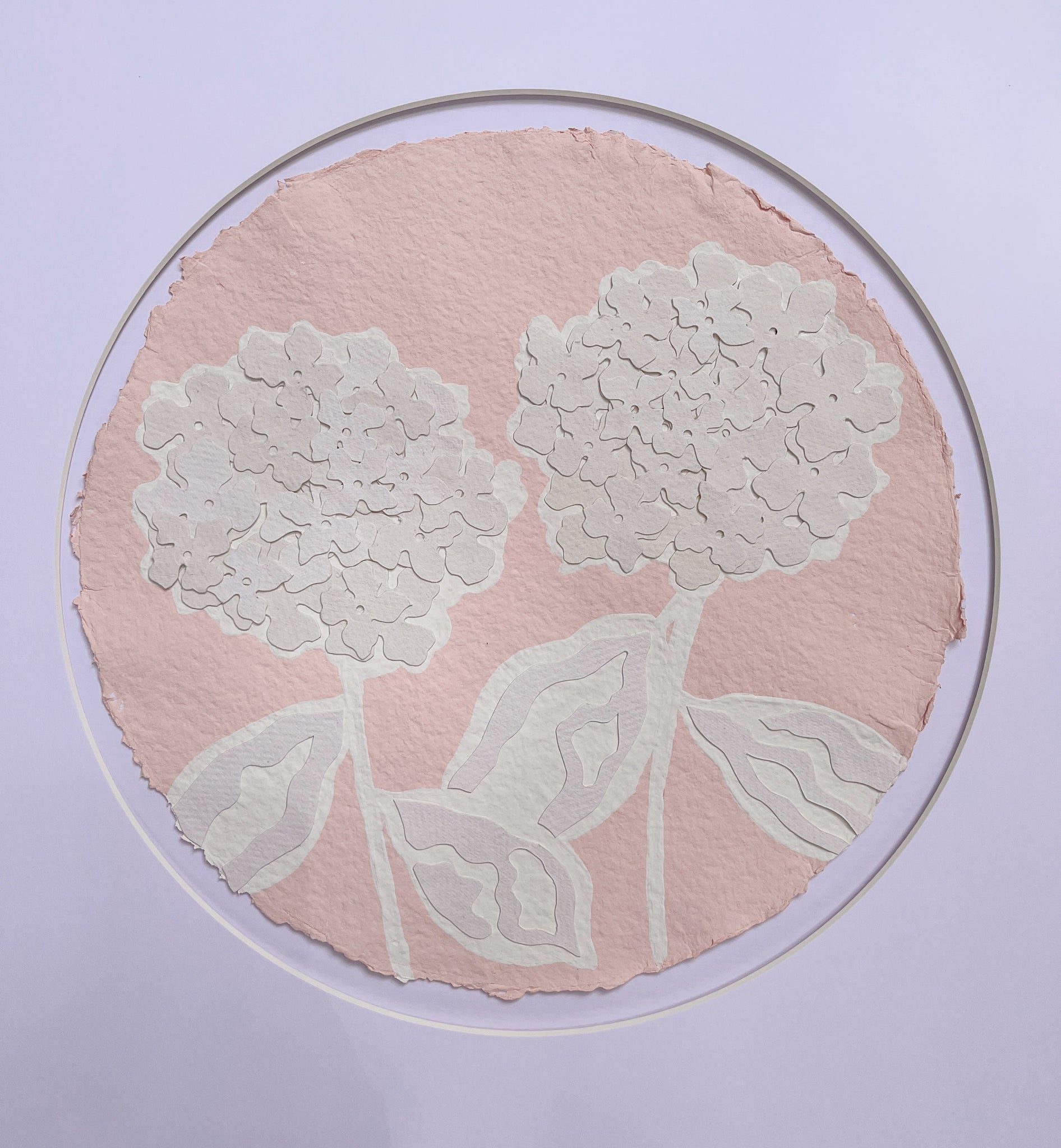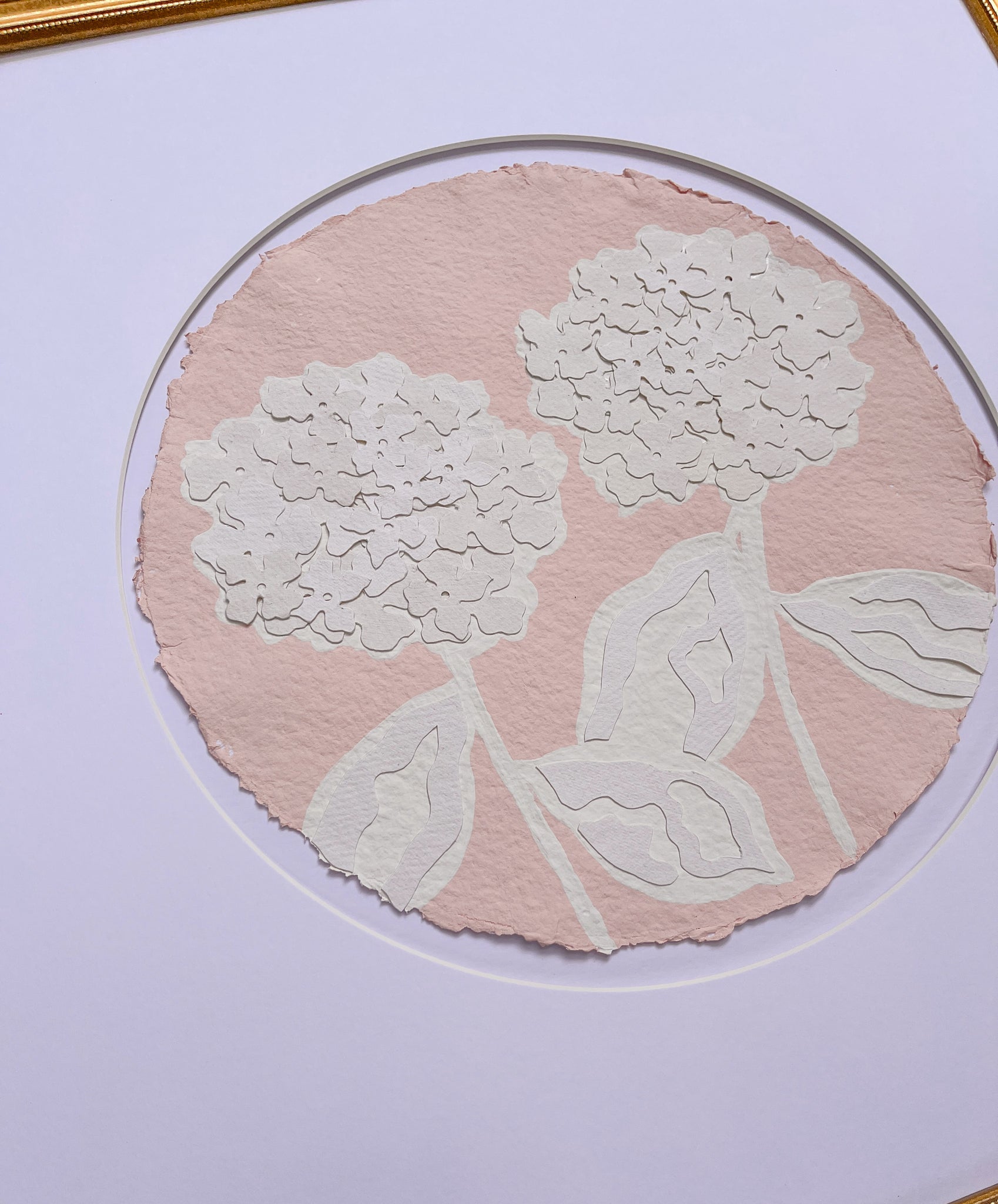 Each hydrangea circle is 12 inch diameter and matted to 20x20. This item is sold with the circular matting only. If you would like your piece framed, please purchase the piece and then message Kendal for framing.