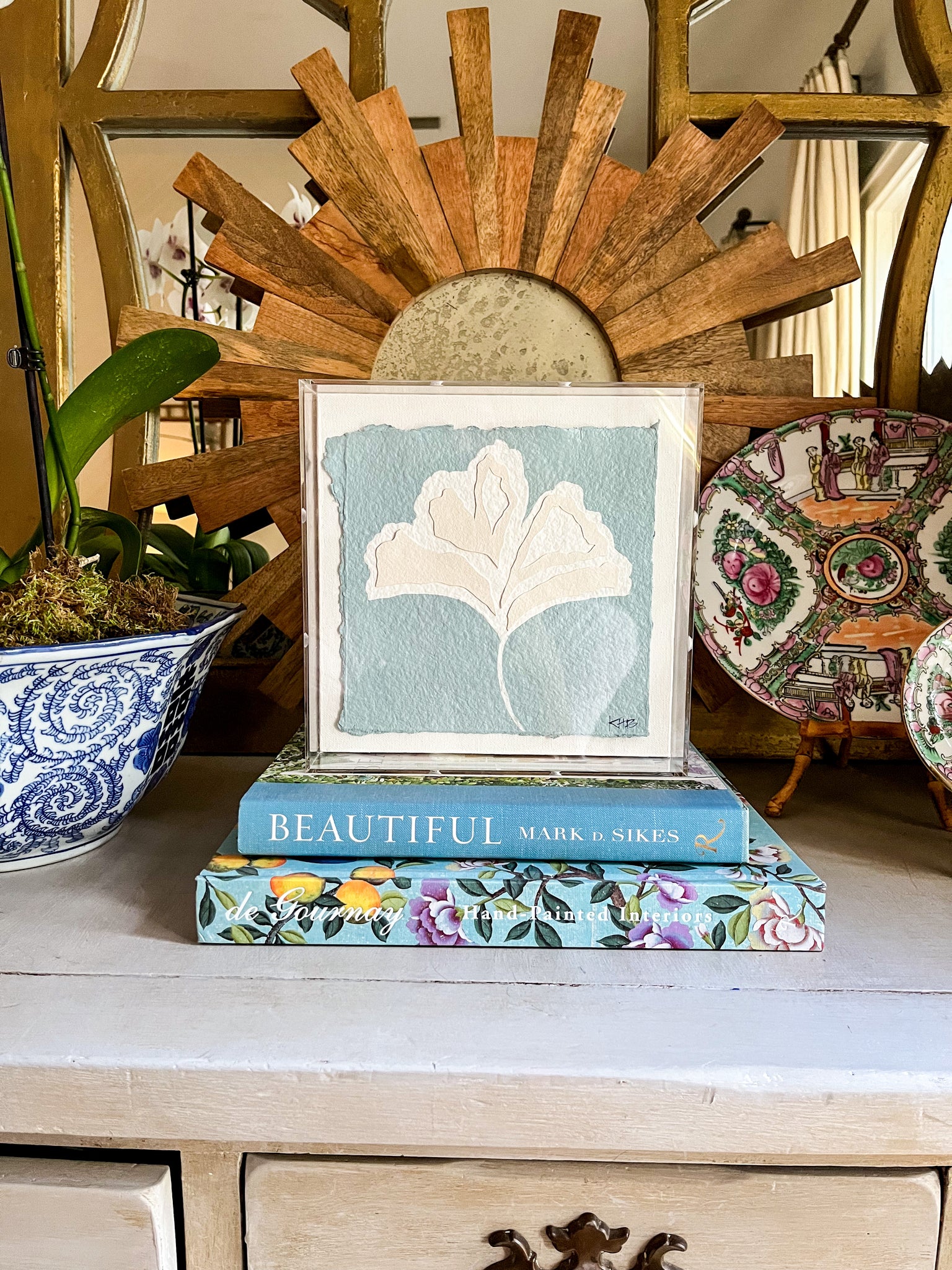 These 7x7 original Collaged Botanicals are painted on hand made paper with deckled edges. Each one is placed on a white canvas and finished in an acrylic box. These are perfect for bookshelves and side tables and the perfect holiday gift.