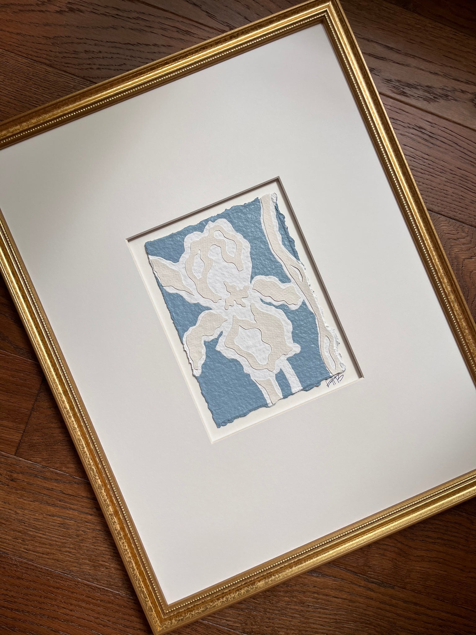 Each botanical is created using acrylic paint on 140 cold pressed watercolor paper and then collaged using handmade paper. A wooden gold frame with small beaded detail and white mating completes the artwork.