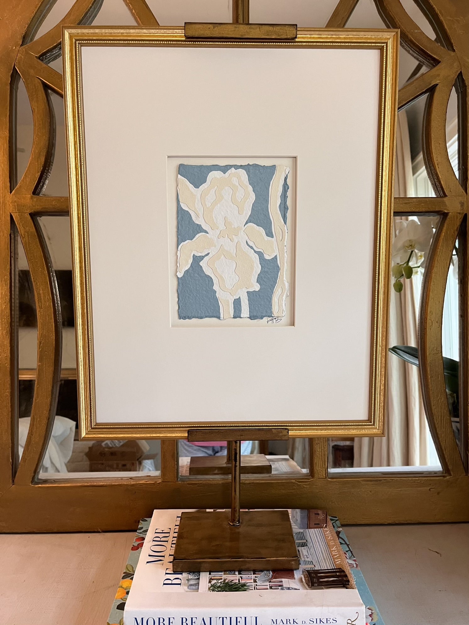 Iris in Blue I, Original Artwork by Kendal Blanchard, Southern artist, Southern art, Flower art, Botanical art, Textured art, Collaged art, Classic artwork, Timeless art, Blue and white artwork, Foliage artwork, Traditional artwork, Original artwork, Traditional home artwork, Painted flowers, Botanicals  Florals, Floral artwork, Coastal artwork