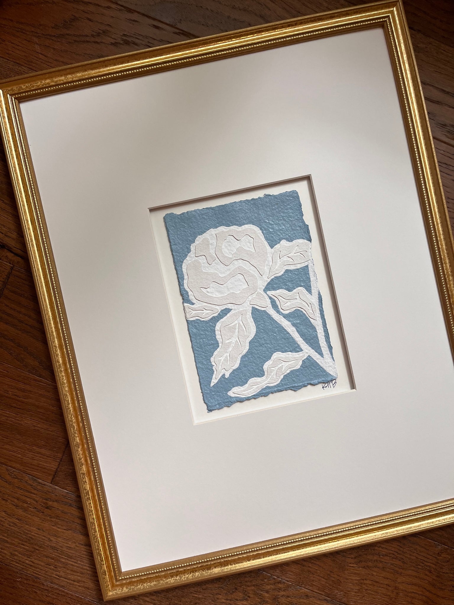 Peony in Blue II, Original Artwork by Kendal Blanchard, Southern artist, Southern art, Flower art, Botanical art, Textured art, Collaged art, Classic artwork, Timeless art, Blue and white artwork, Foliage artwork, Traditional artwork, Original artwork, Traditional home artwork, Painted flowers, Botanicals  Florals, Floral artwork, Coastal artwork