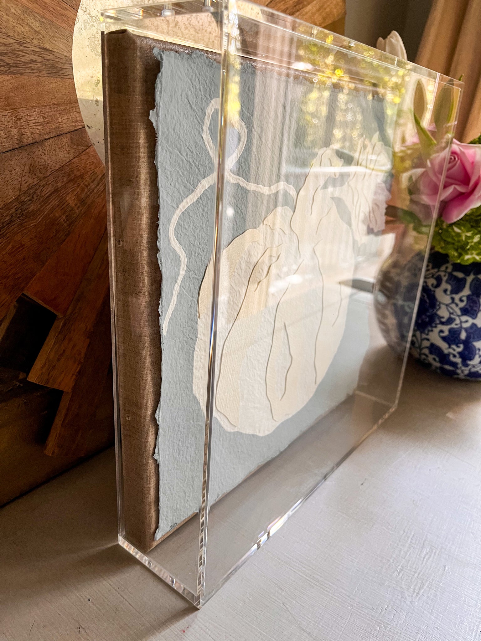 12x12 acrylic painted pumpkin collaged with handmade paper. Each pumpkin is framed in an acrylic box frame measuring 12x12x3.