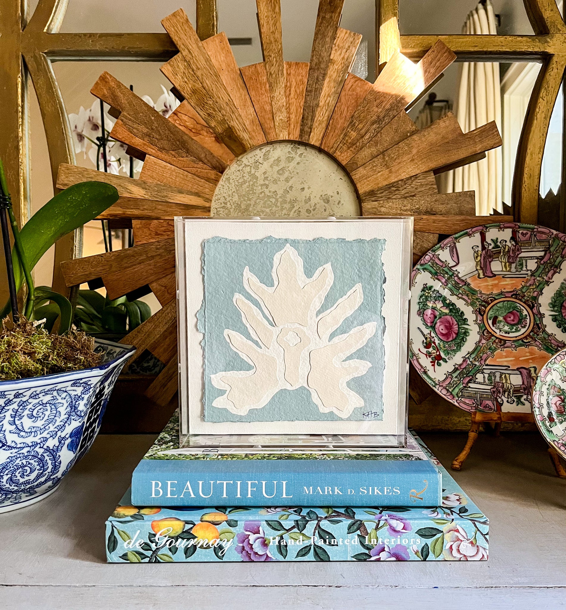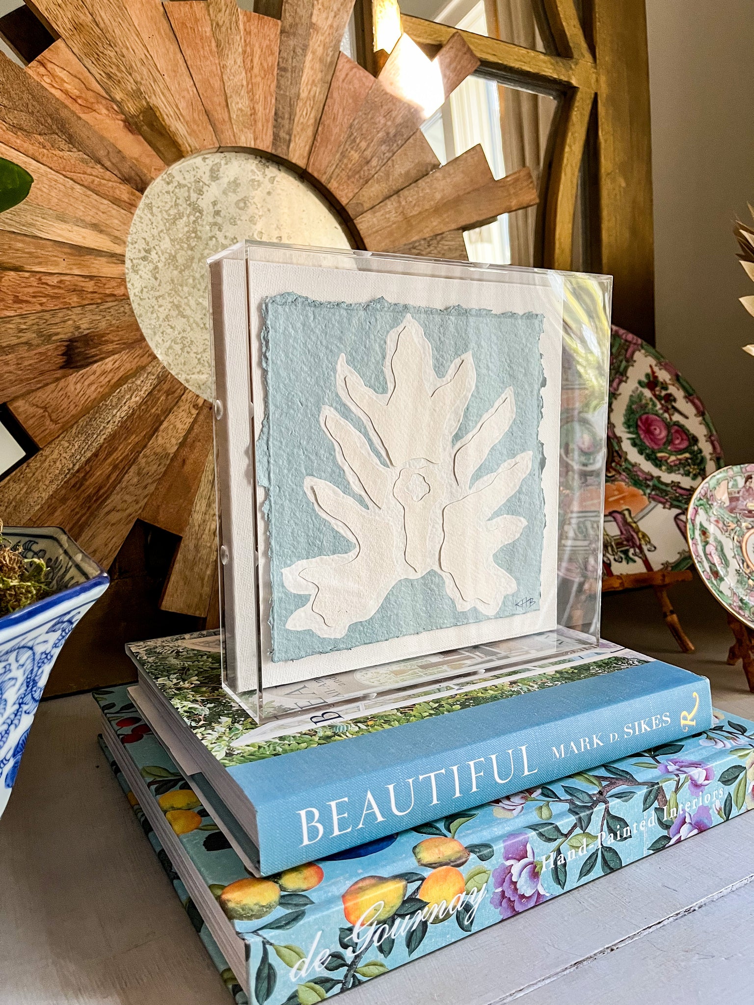 These 7x7 original Collaged Botanicals are painted on hand made paper with deckled edges. Each one is placed on a white canvas and finished in an acrylic box. These are perfect for bookshelves and side tables and the perfect holiday gift.