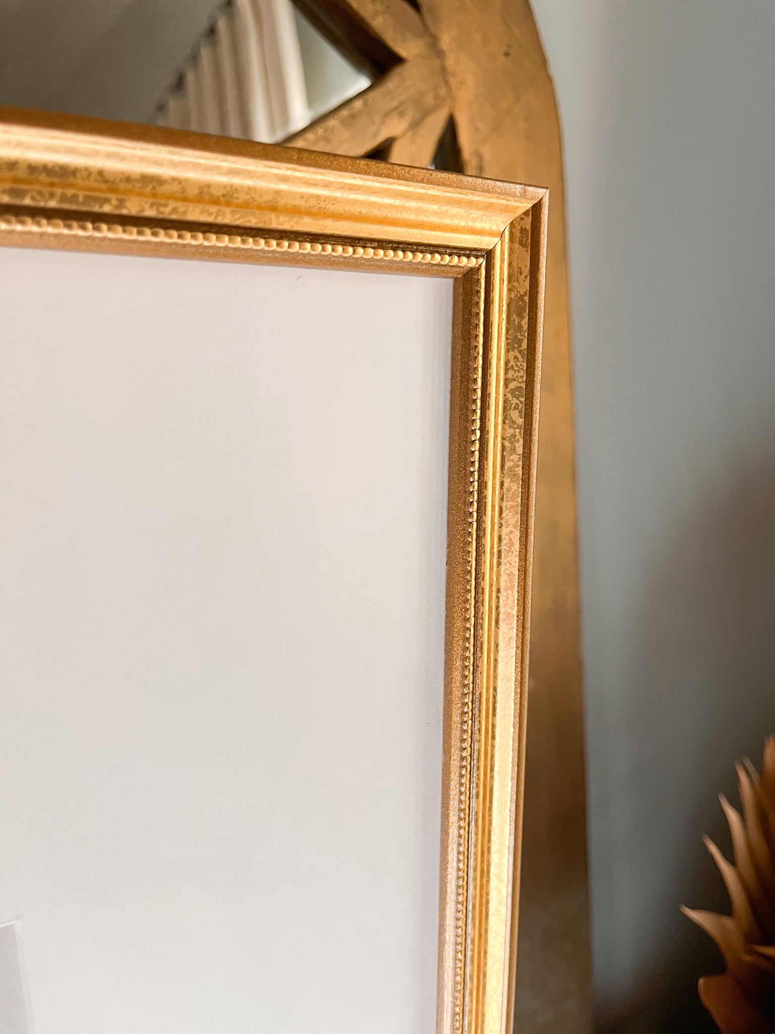 Each botanical is created using acrylic paint on 140 cold pressed watercolor paper and then collaged using handmade paper. A wooden gold frame with small beaded detail and white mating completes the artwork.